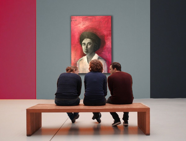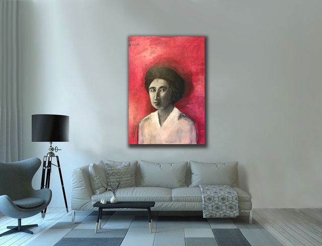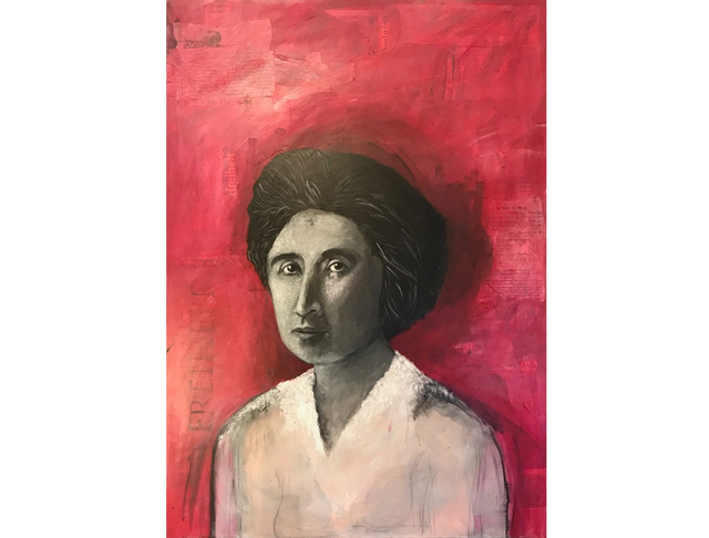 Freiheit ist Rosa – Porträt von Rosa Luxemburg, angefangen 2019, fertiggestellt 2025, 140 x 100 cm, Acryl, Collage auf Leinwand
