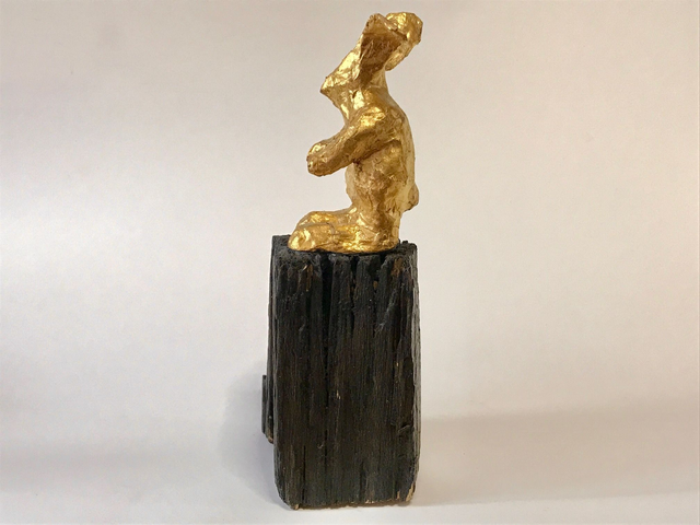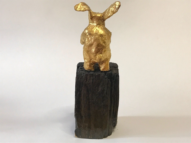 Goldhase – Hase aus Papiermaché mit Blattgold belegt auf Holzsockel, B 7 x H 22 x T 7 cm