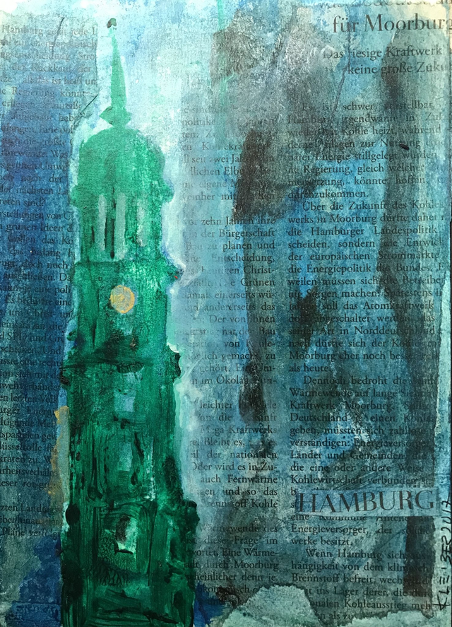 Michel Grün/Blau . Originalgrafik, signiert und datiert, Acryl, Collage auf Papier, 15 x 21 cm