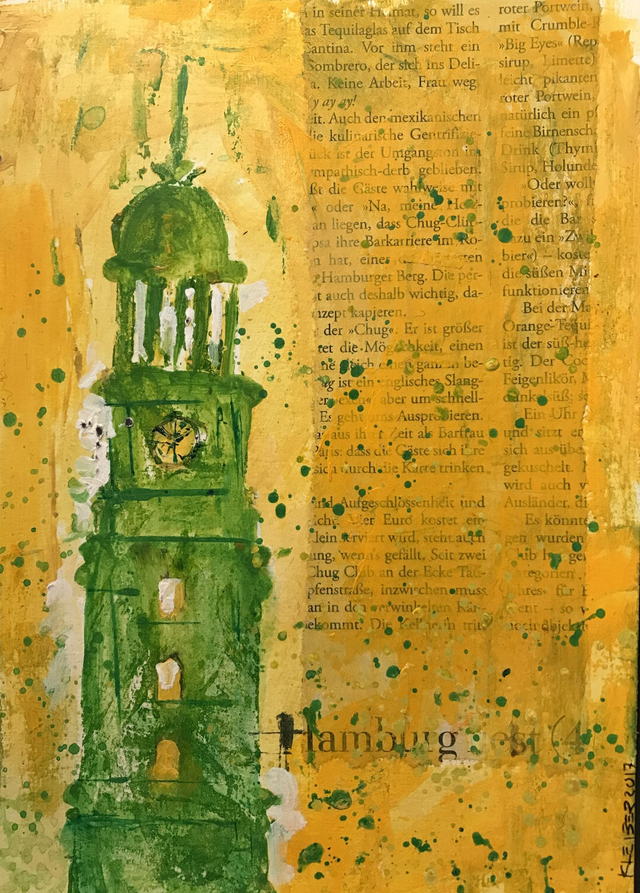 Michel Grün/Gelb . Originalgrafik, signiert und datiert, Acryl, Collage auf Papier, 15 x 21 cm