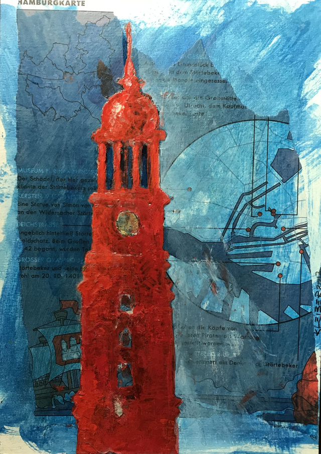 Michel Rot/Blau . Originalgrafik, signiert und datiert, Acryl, Collage auf Papier, 15 x 21 cm