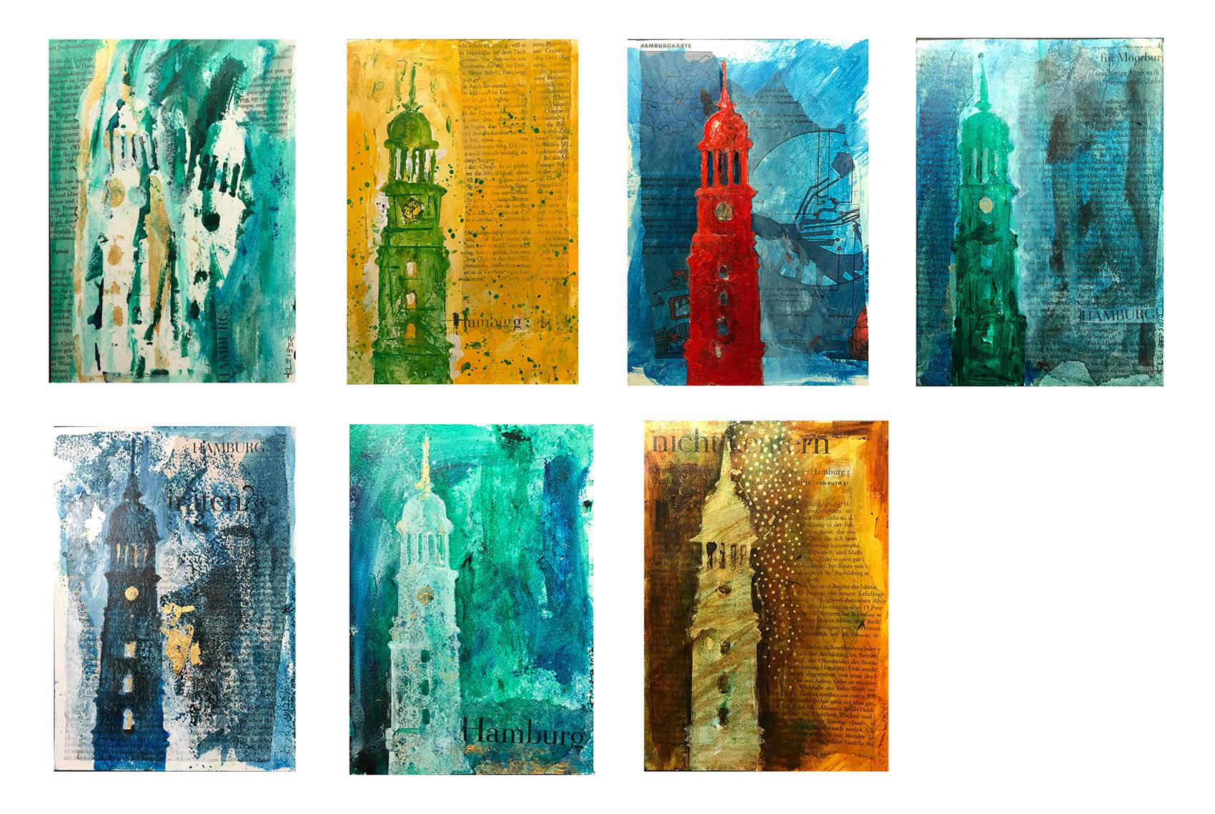 Dieses Produkt besteht aus 15 Postkarten von meinen Hamburg-Motiven, die ich bisher nur als Postkarten und teilweise auch noch als Originale in der Schmuckgalerie von Anne Zimmer in der Wexstraße 28 in der Hamburger Neustadt angeboten habe. Die Sammlung von 15 Postkarten enthält 12 unterschiedliche Motiven von Elbphilharmonie, Michel und Hafengiraffen plus drei Extra-Karten in einer schwarzen Karton-Box und ist hier erhältlich.